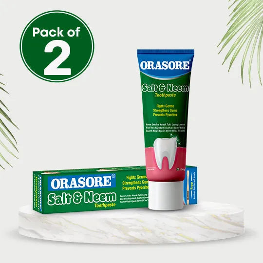 Orasore Salt & Neem Toothpaste brings together the power of two ancient natural ingredients - Salt and Neem - to provide you with a refreshing and effective oral care experience. Crafted with a commitment to purity and effectiveness, this toothpaste offers a natural alternative to conventional oral care products. Neem: Neem, also known as Azadirachta indica, is renowned for its antibacterial properties. For centuries, neem has been used in traditional medicine for its ability to combat oral bacteria, plaque, and gum inflammation. It helps maintain oral hygiene by fighting off harmful bacteria that can lead to cavities, gingivitis, and bad breath. Salt: Salt has been used as a natural cleansing agent for oral care for generations. It helps to gently scrub away plaque and stains from the teeth while also balancing the pH levels in the mouth. Salt is also known for its ability to reduce inflammation and promote healing in the gums.