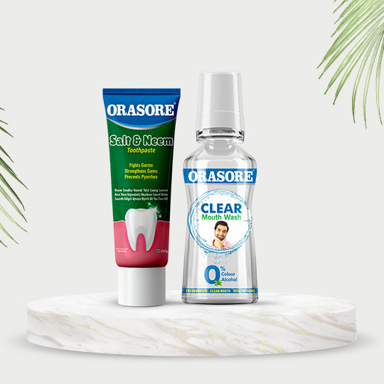Experience the holistic dental care of the Orasore Salt & Neem Duo, featuring our Salt & Neem Toothpaste and 250ml Clear Mouthwash, designed to enhance your oral hygiene regimen. The Orasore Salt & Neem Toothpaste harnesses the powerful antibacterial properties of Salt and Neem to effectively combat harmful bacteria, reducing the risk of cavities and gum diseases. Its gentle abrasive action removes surface stains and plaque, unveiling a brighter, cleaner smile. Infused with Tulsi, Lemon, and Aloe Vera, this toothpaste soothes gums, reduces inflammation, and promotes healing. Lemon serves as a natural whitening agent and breath freshener, while Tulsi contributes antibacterial and anti-inflammatory benefits, supporting gum health. Paired with the toothpaste, the Orasore Clear Mouthwash features a gentle, alcohol-free formula that hydrates and soothes your mouth without burning or irritation. Crafted with 12 potent natural ingredients, including Neem, Pudina, Miswak, and Clove Oil, this Ayurvedic mouthwash strengthens teeth, prevents gum infections, and eliminates bad breath. Its antiseptic properties ensure thorough cleaning, leaving your mouth feeling fresh and invigorated.