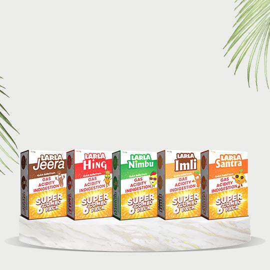 Larla Super 6 Combo Pack | Natural Digestive Powder | Quick Relief from Gas, Acidity & Indigestion | Nimbu, Santra, Hing, Imli & Jeera Each Flavour 6 x 5g Sachets | Tasty & Effective | (Pack of 5)